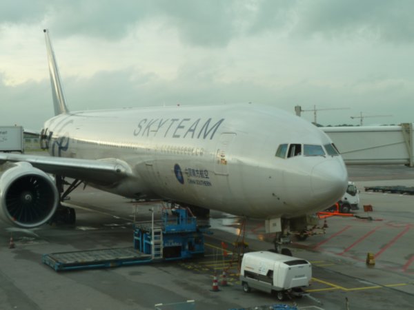 Op de instapkaarten van ons stond dat we stoelen hadden op 39K en 43K, wat dus vijf rijen uitelkaar was. We zijn daarom maar vroeg (om 13:52) in de rij gaan staan. In het vliegtuig een van de stewards aangesproken op het feit dat ik graag naast Li-Xia wilde zitten vanwege haar problemen. Of hij me helemaal begreep, wist ik niet. Later kwam er nog een stewardes bij en die leek het beter te begrijpen. We moesten eerst maar op onze stoelen gaan zitten en dan zouden ze na de start kijken wat ze konden doen. Om 14:13 zaten we op onze stoelen (overigens op 39H en 43H, aan het gangpad in plaats van aan het raam). Li-Xia zat naast twee vrouwen die bij elkaar hoorde. Ik zat naast een Chinese man die niet wilde ruilen omdat we op de eerste rij naar de business class zaten en dus extra veel beenruimte hadden. Even later kwamen de stewards en brachten ons naar stoelen 41A (ik) en 42B (Li-Xia) die leeg waren gebleven. De jongen van 42D was inmiddels naar de stoel op 39H verhuist. Echter net voordat we gingen rijden om 14:45 verschenen als nog de mensen die eerst niet waren komen opdagen en werden wij weer terug gestuurd naar onze oorspronkelijke zitplaatsen. (En ook die ene jongen moest weer terug.) Even later wisten de stewards echter te regelen dat degenen die op stoel 40H (achter mij) zat kon ruilen met Li-Xia. Toen een Nederlands echtpaar begreep dat wij naast elkaar wilde zitten, maakte ze onmiddelijk plaats voor ons. Ik vertelde hen spontaan dat Li-Xia de ziekte van Alzheimer had. Om 14:51 zaten we dus op de stoelen 41H (ik) en 41J (Li-Xia) en was de stoelendans ten einden. We moesten nog even wachten voordat we konden opstijgen. Pas om 15:25 zaten we in de lucht.