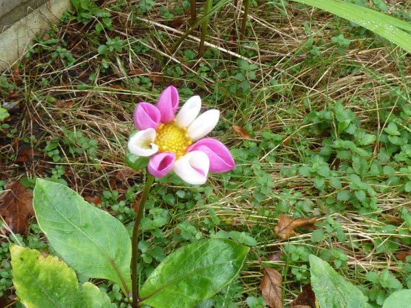 Conny noticed a flower in our back garden. I am a bit surprised by the number of flowers you can still see outside. I have no idea what kind of plant it is, but the flower does have white and pink petals and a yellow center. It could be a Dahlia 'Twyning's Smartie'.Sunday, October 19, 2025